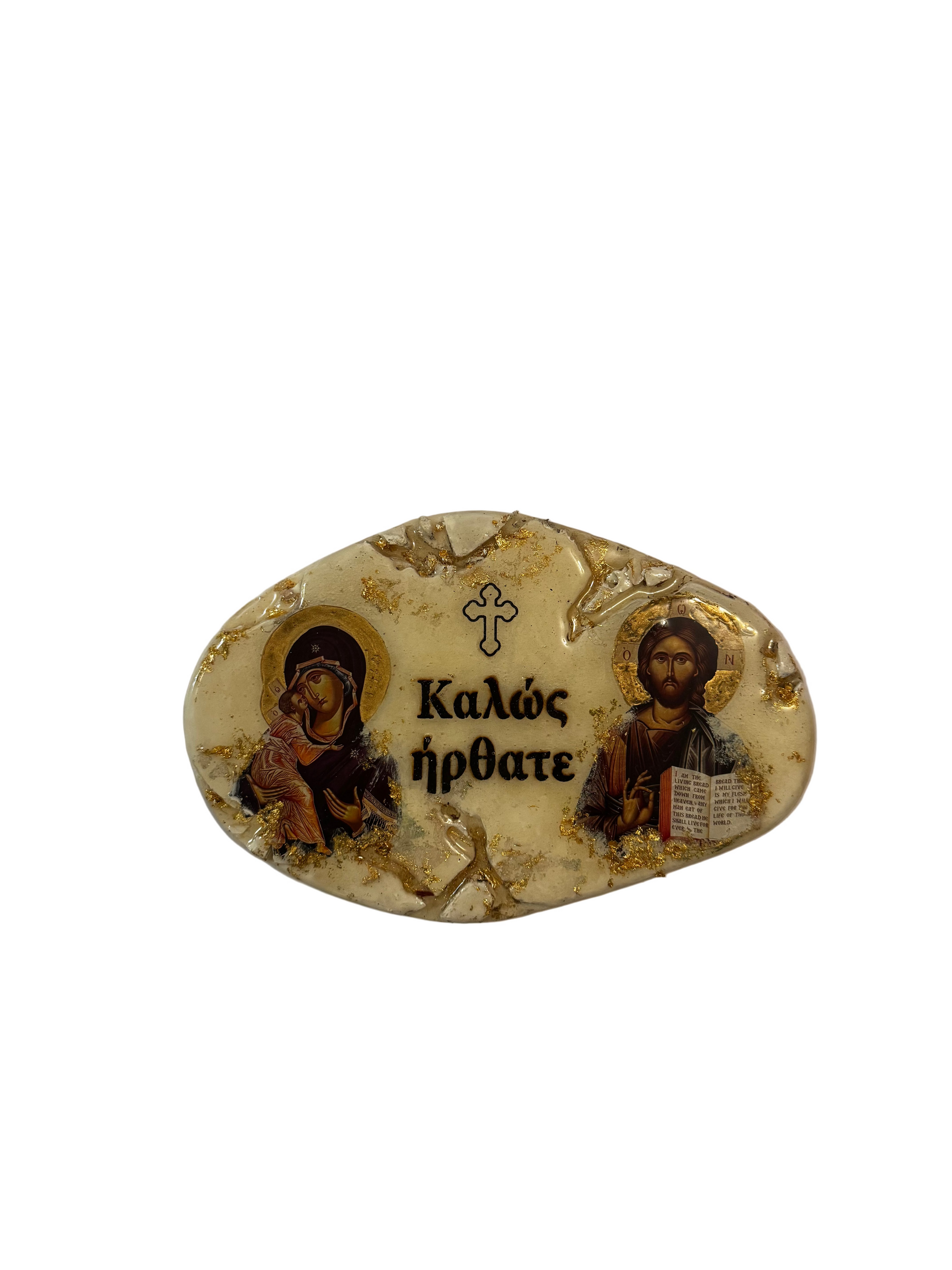 Depicting Jesus and Panayia and the Greek words for welcome , this piece shows a Christian and peaceful place to be welcomed into.
